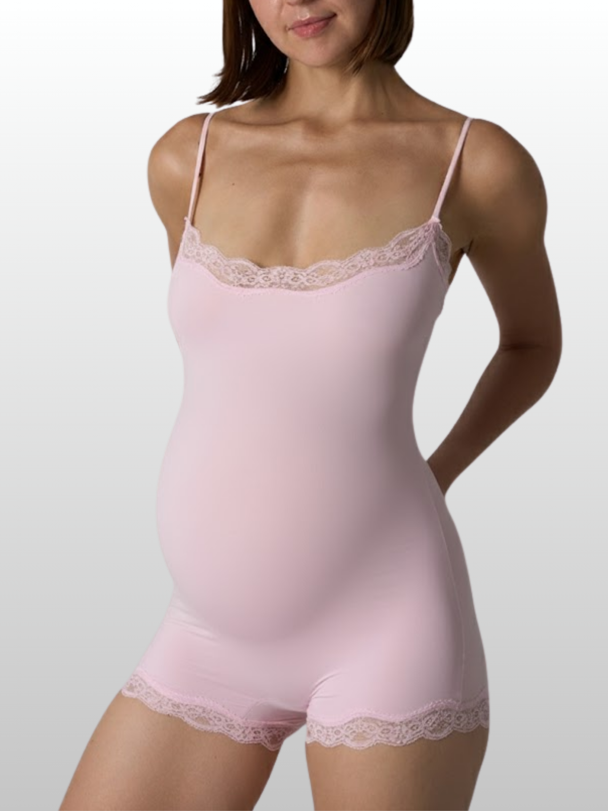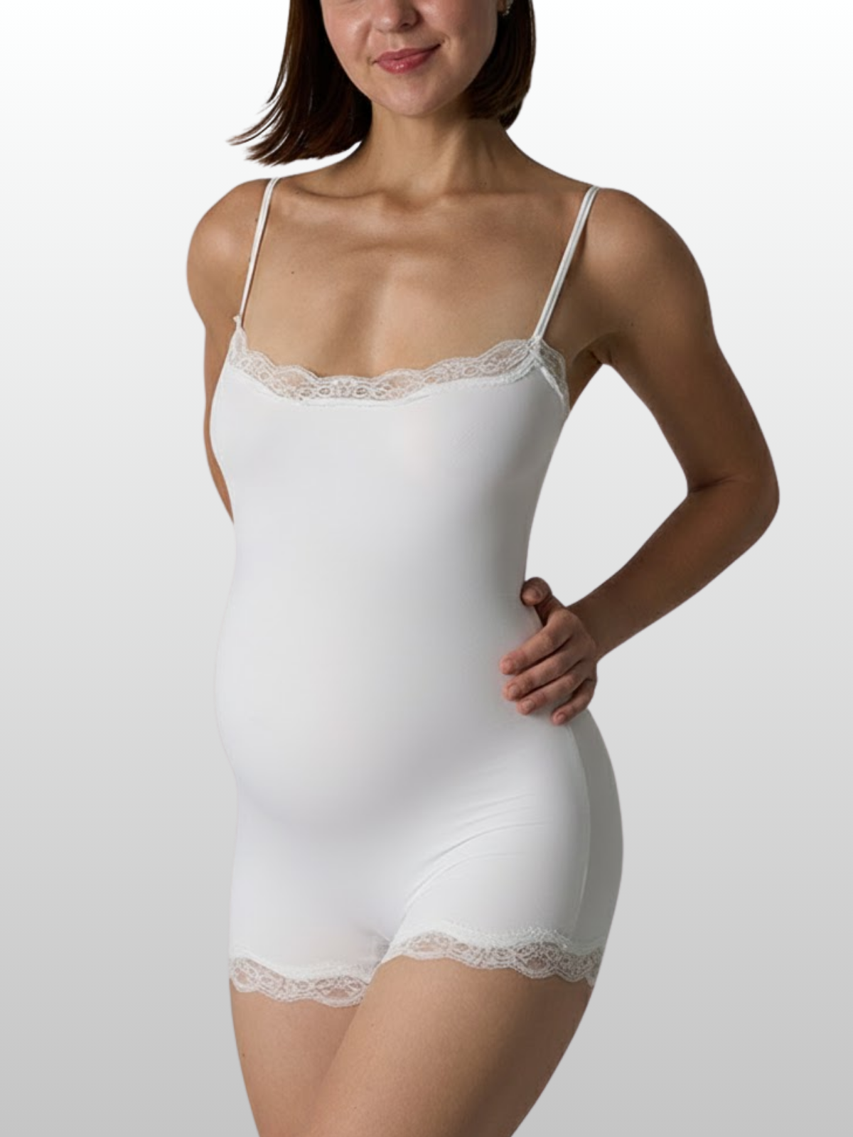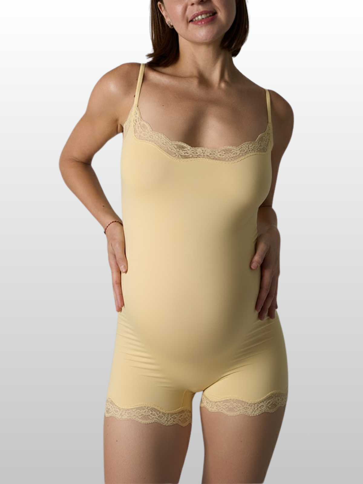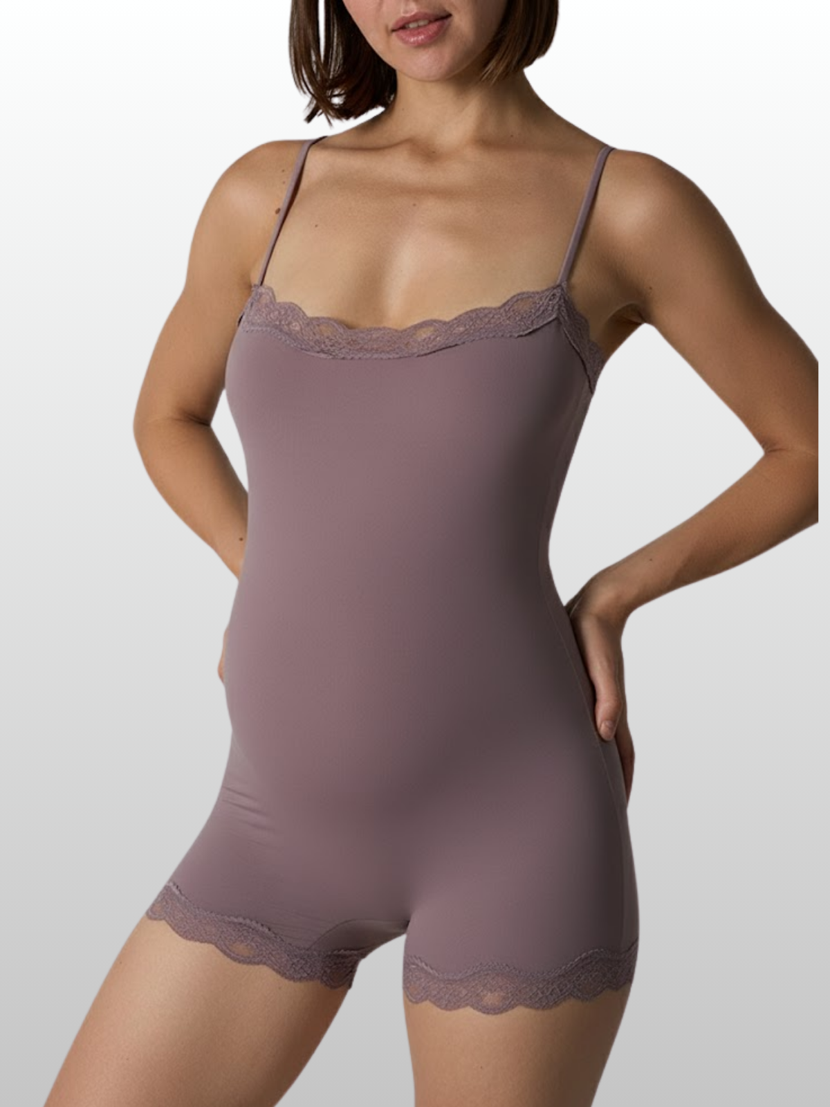 mumshape™ Lace Trim Spaghetti Strap Bodycon Umstands-Romper - Spitzenbody für Schwangerschaft & Stillzeit